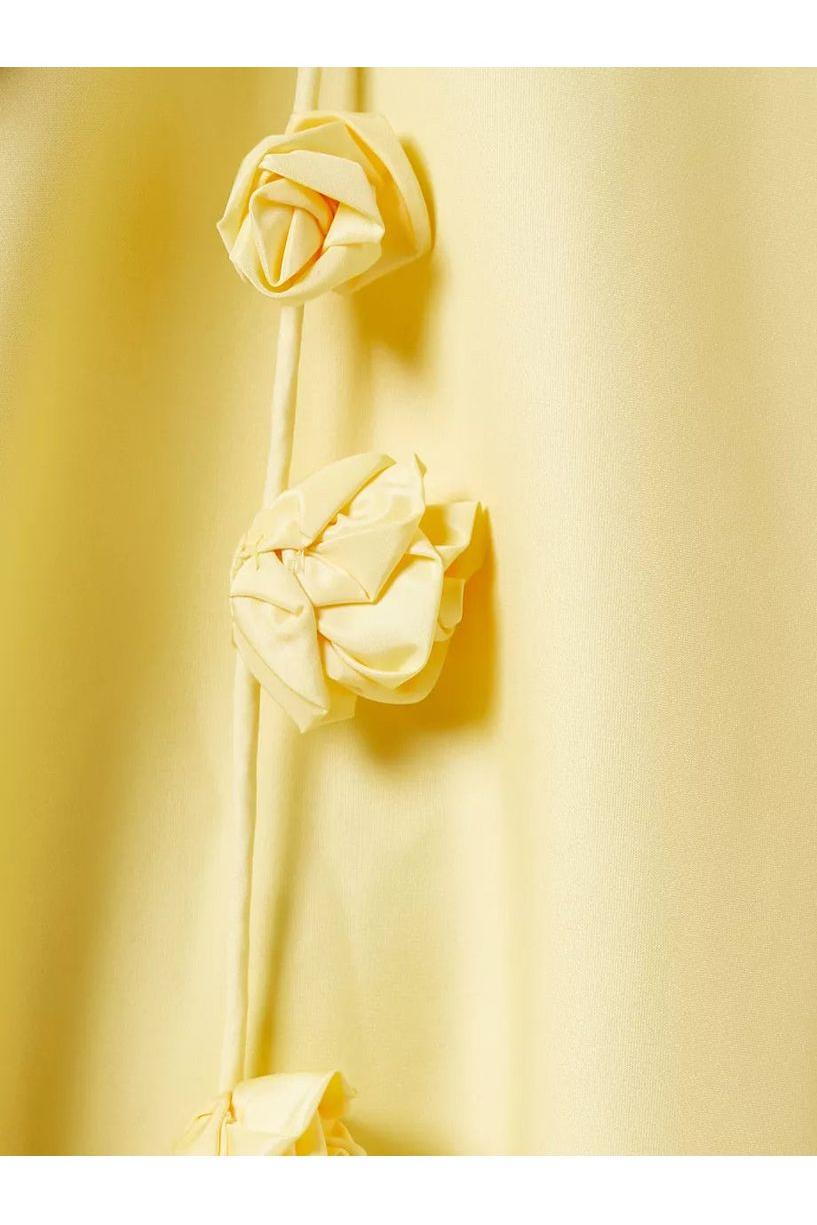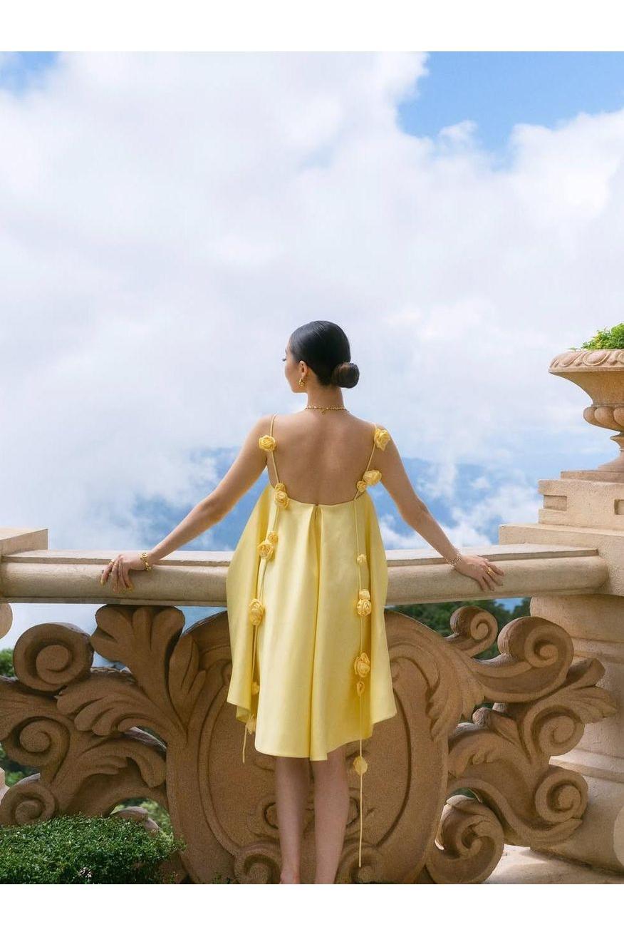 Fiona mini dress offers a fresh take on feminine style with its playful A-line silhouette and high-low hem. Exuding understated elegance, it features a straight neckline framed with rose-appliqué straps that trail at the back.