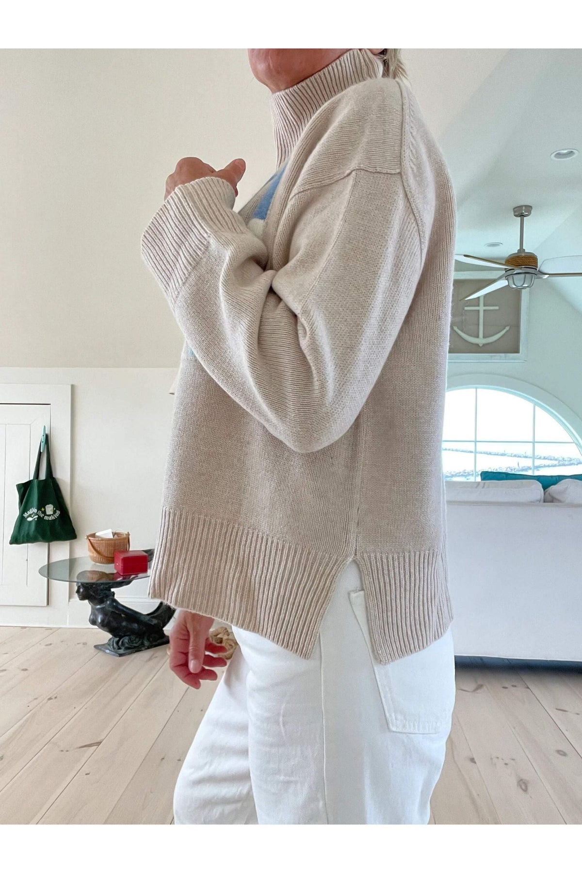 Incredibly soft turtleneck sweater with a custom intarsia knit graphic and Retro stripes down the sleeve.